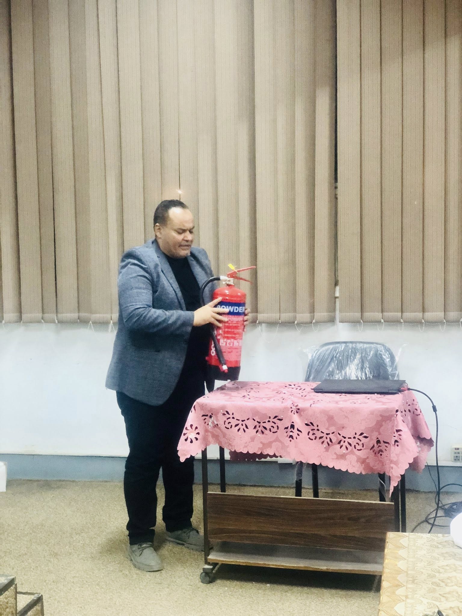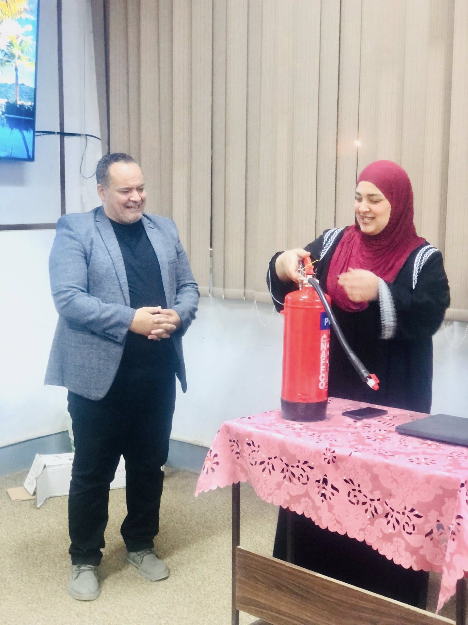 بالإضافة إلى القيام بشرح عملي حول كيفية استخدام طفايات الحريق، وطرق التعامل الآمن مع حالات الحريق.