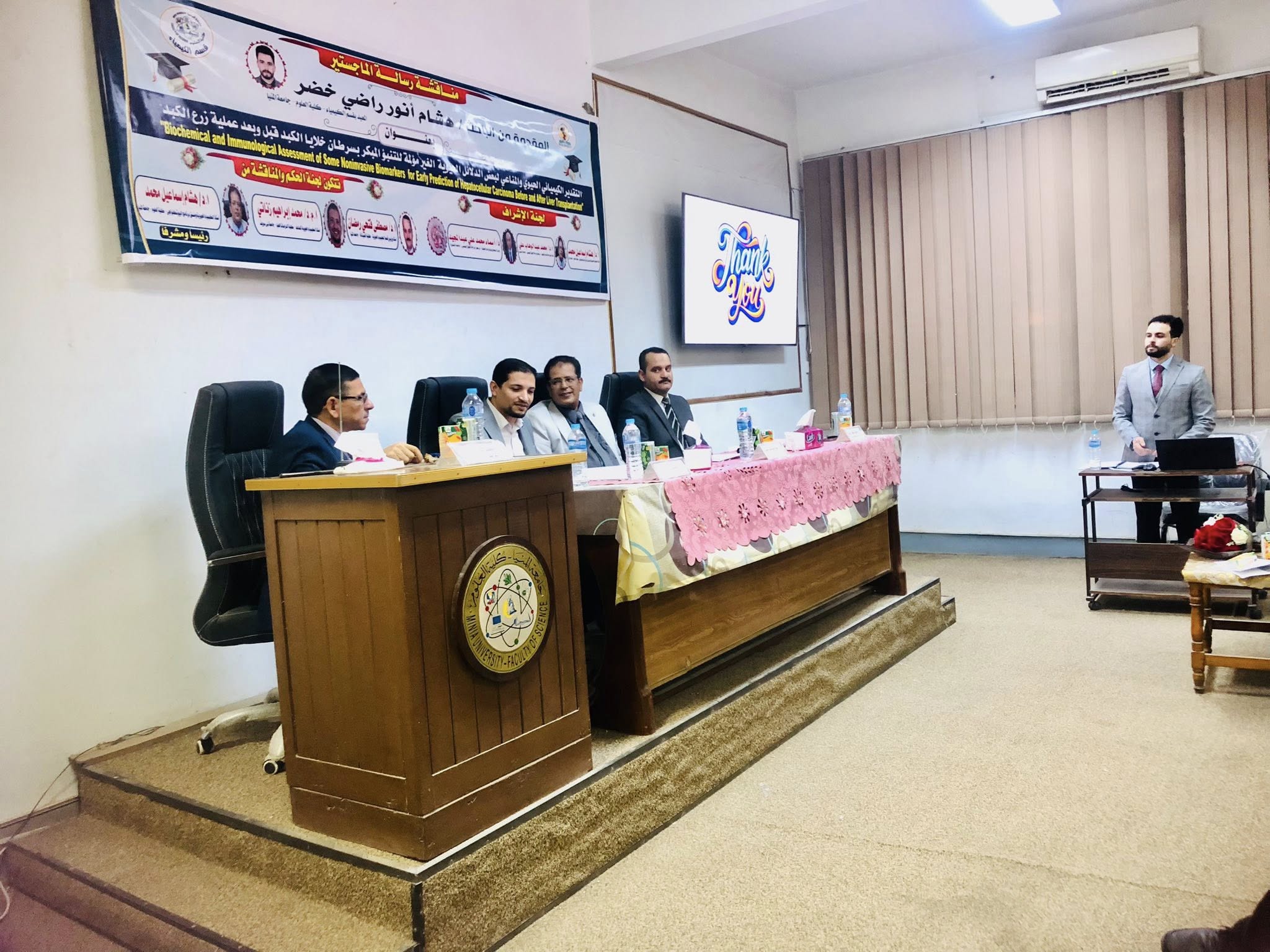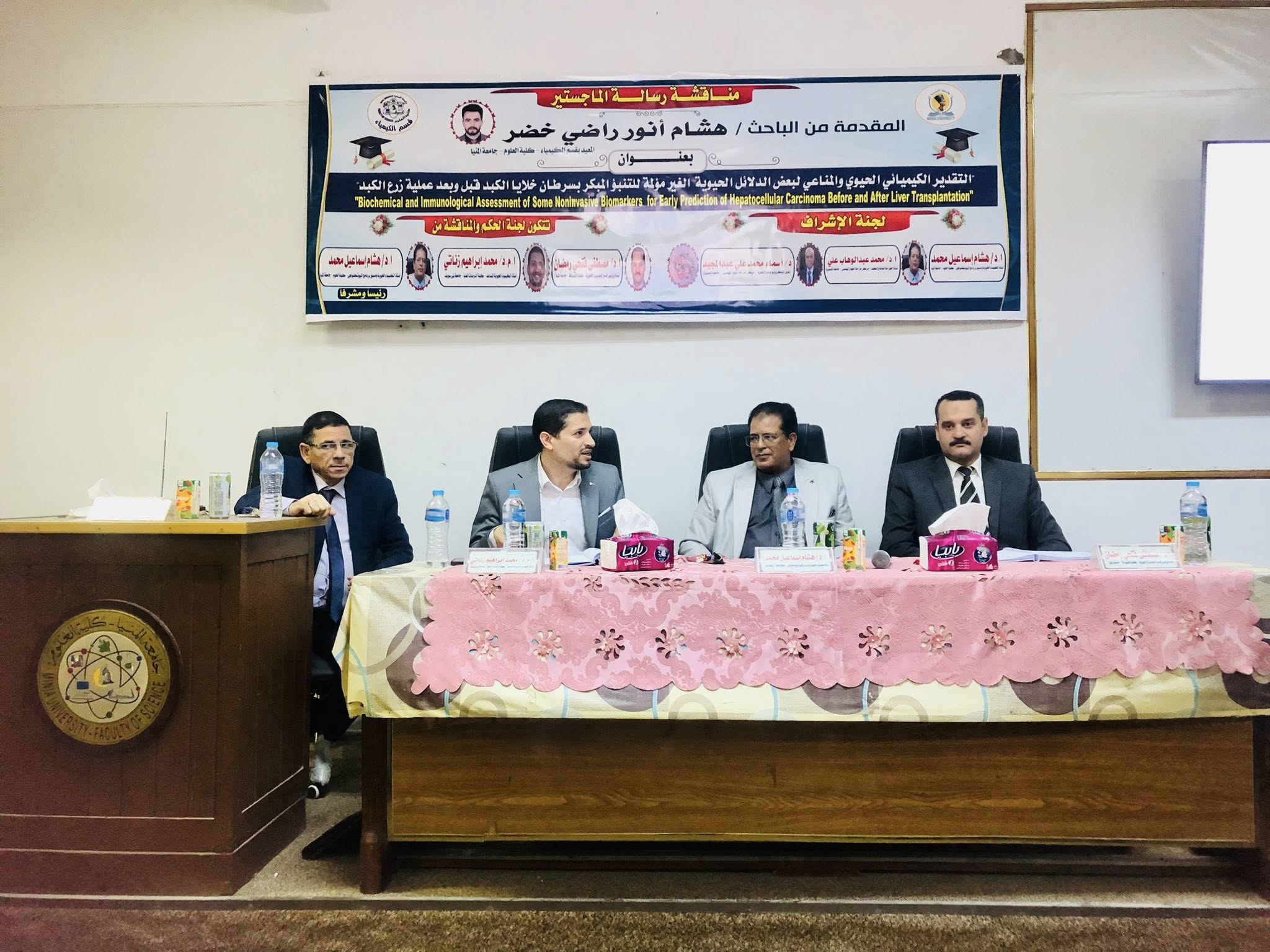 Le Jeudi 23/10/2025, Soutenance de la thèse de Magistère du Chercheur/ Hisham Anwar Radi Khader, Assistant au Département de Chimie, cela s'est tenue à 12h00 à la salle de séminaire au bâtiment des sciences biologiques à la Faculté des Sciences– Université de Minia.